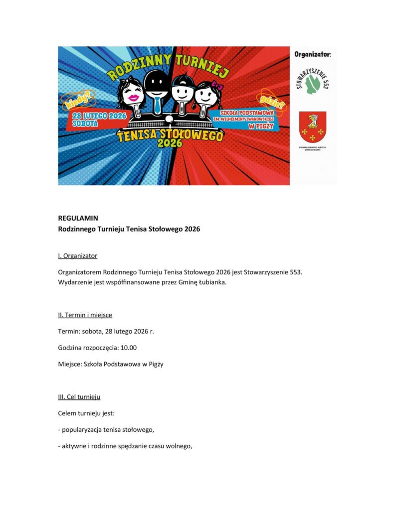 Uruchamiamy internetowe zapisy do udziału w Rodzinnym Turnieju Tenisa Stołowego 2026. Wydarzenie, które odbędzie się w najbliższą sobotę 28 lutego w Szkoła Podstawowa im. prof. Wilhelminy Iwanowskiej w Pigży, organizuje nasze Stowarzyszenie 553, zostało dofinansowane ze środków Gminy Łubianka Gmina Łubianka – Słoneczna Gmina.